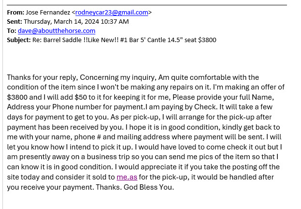 Scam Alert If you have posted a saddle and you get an e-mail like this: